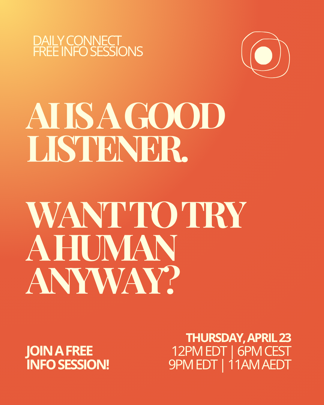 A daily 15-minute virtual practice informed by social neuroscience research, where two people meet, reflect on a moment of difficulty and gratitude from their day, and listen deeply without interruption or advice. In other words: an embodied practice of Oneliness.